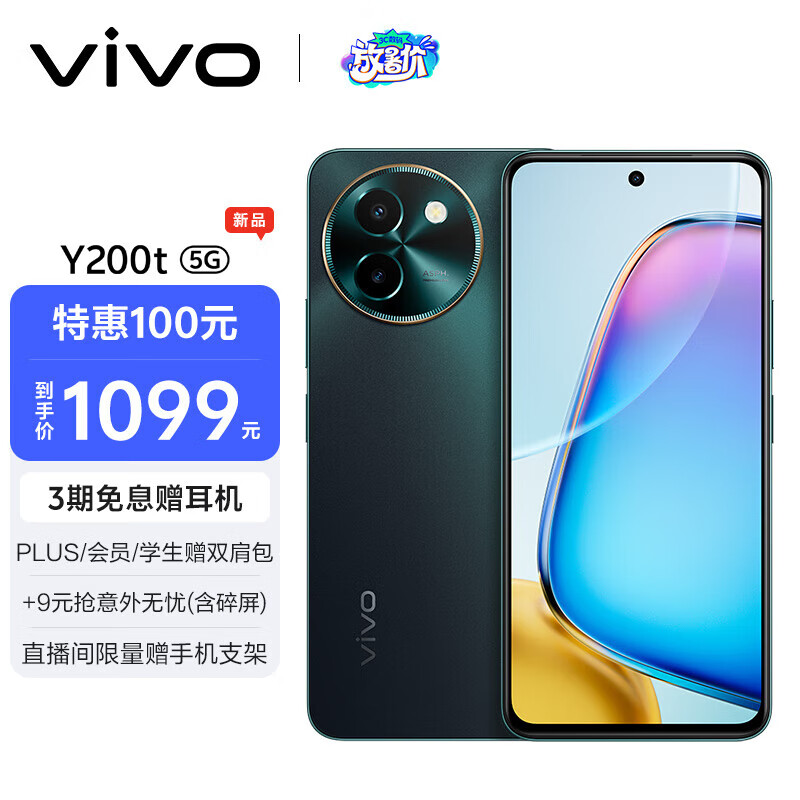 vivo Y200t 8GB+128GB 极光 44W 6000mAh 120Hz金刚护眼屏 双扬300%大音量 5G 拍照 手机价格:1199.00元!