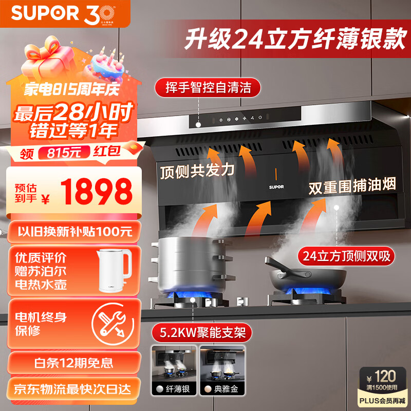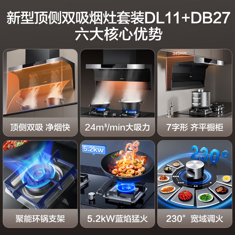 苏泊尔(SUPOR)抽油烟机 顶侧双吸7字型烟灶套装24立方挥手免拆洗家用烟机燃气灶具套装DL11+DB27天价格:1898.00元!