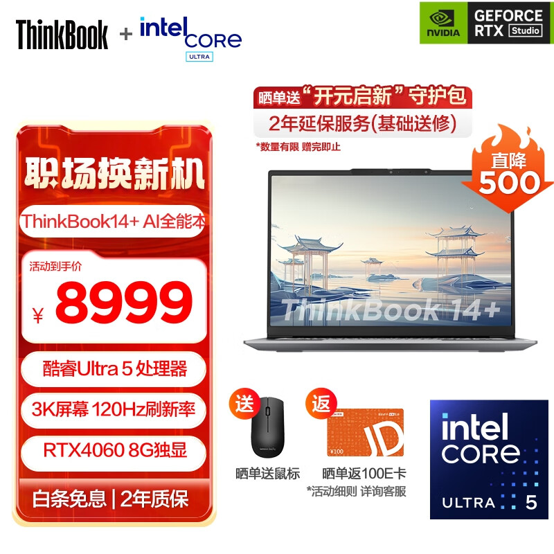 ThinkPad联想ThinkBook14+2024 AI轻薄全能本 全新英特尔酷睿Ultra标压处理器 14.5英寸商务办公笔记本电脑 Ultra5 125H 32G 1T 0ECD独显价格:8999.00元!
