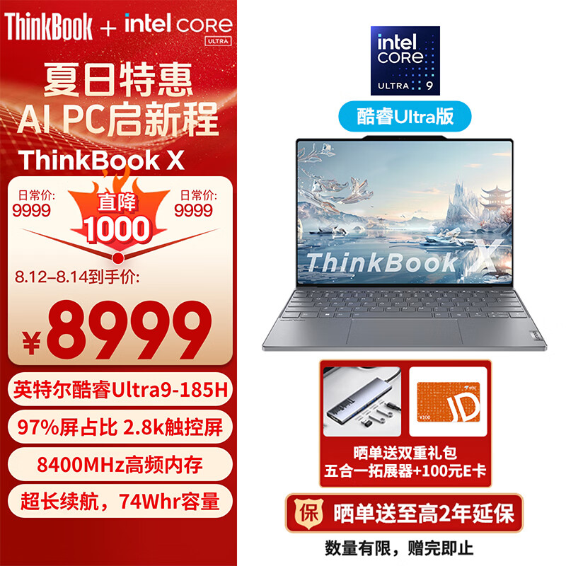 ThinkPad联想笔记本电脑ThinkBook X 2024 英特尔酷睿Ultra9 185H 13.5英寸 32G 1T 2.8K AI高刷触控屏办公价格:8999.00元!