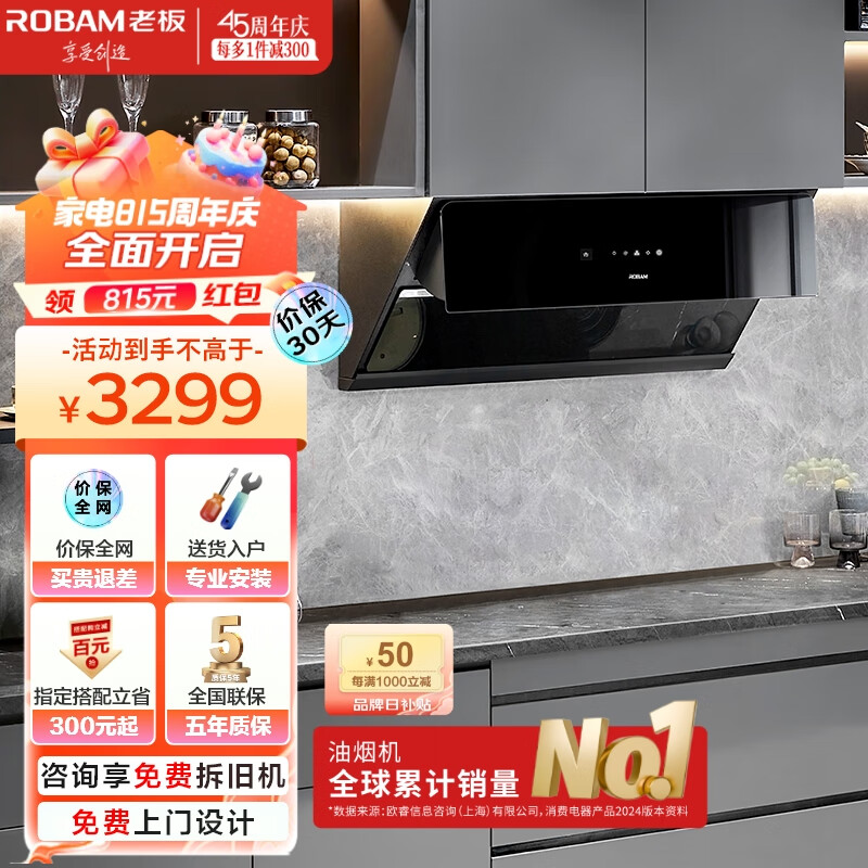 老板(Robam)抽油烟机探索家29A8CS变频侧吸式油烟机家用 25m3/min大风量低噪1000Pa挥手智控吸油烟机价格:3299.00元!