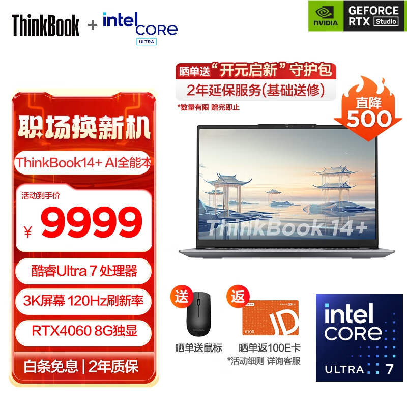 ThinkPad联想ThinkBook14+2024 AI轻薄全能本 全新英特尔酷睿Ultra标压处理器 14.5英寸商务办公笔记本电脑 Ultra7 155H 32G 1T 0FCD独显价格:9999.00元!