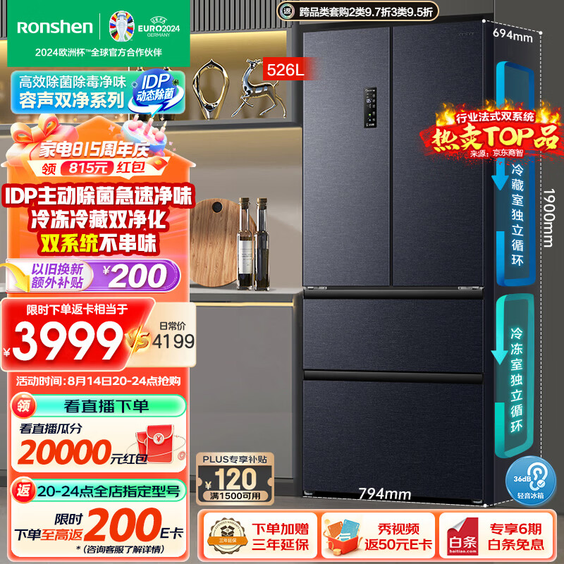 容声(Ronshen)526升双净双系统电冰箱法式对开多门四开门风冷无霜灰色一级能效家用节能变频大容量BCD-526WD1MPA价格:4699.00元!