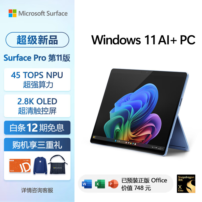 微软(Microsoft)全新Surface Pro第11版 骁龙X Elite 16G 1T 宝石蓝二合一平板笔记本电脑 学生平板 AIPC Pro 11价格:13288.00元!