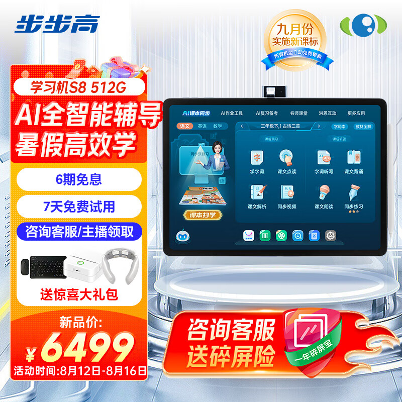 步步高(BBK)学习机S8 8+512G 14.2英寸AI学习机平板小学到高中课程同步全年龄段学生平板学习平板家教机早教机价格:6499.00元!