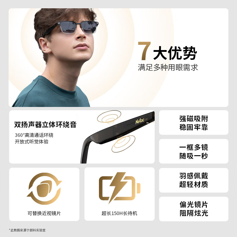 朗科(Netac)朗科智能音频眼镜平视镜片 简约蓝牙耳机 防尘防水 高清通话 一镜3用一秒切换 LK-EW01A银色套装价格:699.00元!