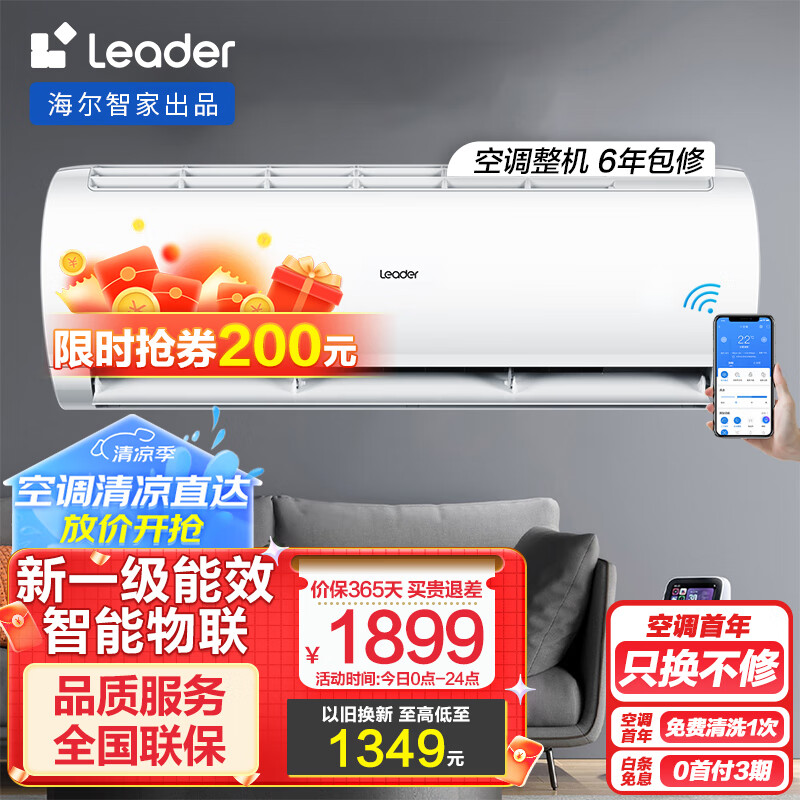 Leader海尔智家空调挂机家用1.5匹变频节能新一级能效冷暖卧室壁挂自清洁空调KFR-35GW/02XCA81TU1[家电]价格:2099.00元!
