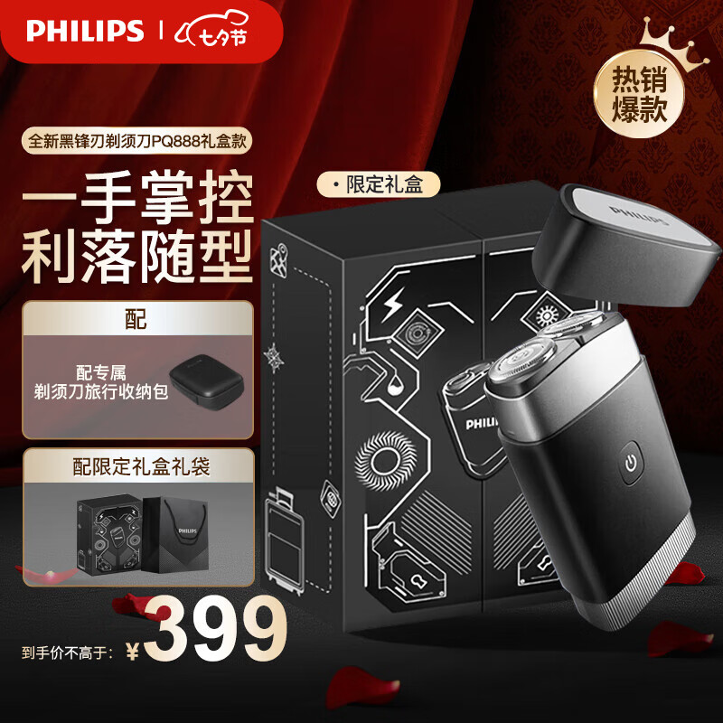 飞利浦(PHILIPS)剃须刀电动旅行便携式黑锋刃刮胡刀 全身水洗1小时快充胡须刀 男士七夕情人节礼物送男友送老公 PQ888/06【远山黑】 礼盒装价格:499.00元!