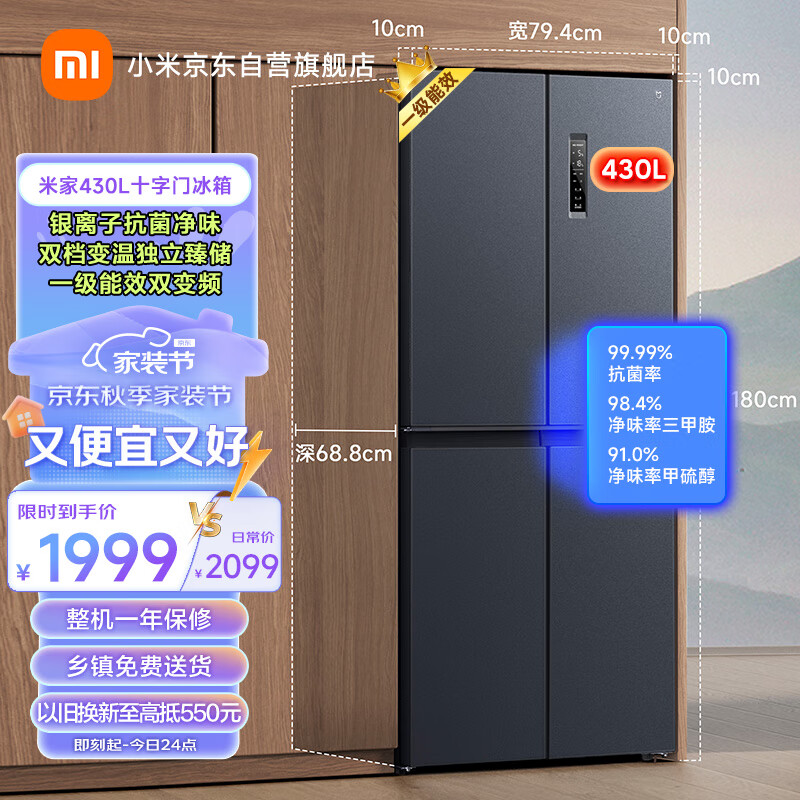 米家小米430升分区养鲜超薄大容量十字对开门双开门家用冰箱 一级能效银离子除菌净味BCD-430WMSA价格:1999.00元!