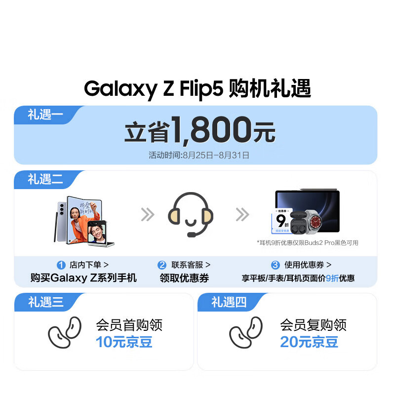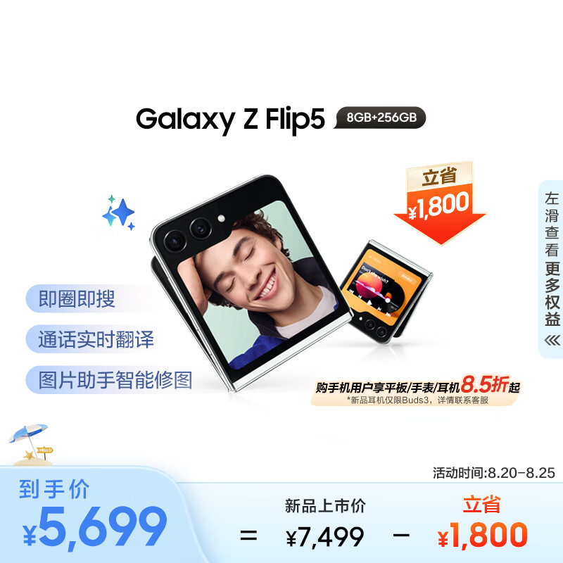三星(SAMSUNG)Galaxy Z Flip5 AI手机 智能外屏 掌心折叠 同声翻译 智能修图摄像 8GB+256GB 冰玫紫 折叠屏手机价格:5699.00元!