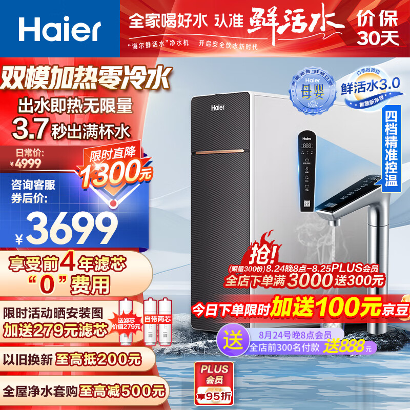 海尔(Haier)新品1000G鲜腾加热直饮一体机【鲜活水系列】家用即热零冷水净水器RO反渗透直饮机HKC2400-R995HU1价格:3999.00元!