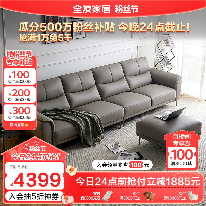 全友家居 直排式真皮沙发客厅现代简约头层牛皮一字皮艺沙发112011价格:6284.29元!