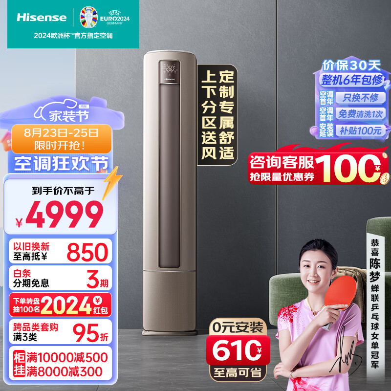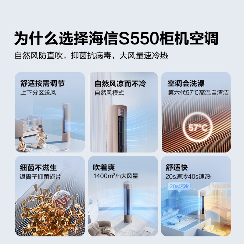 海信(Hisense)大3匹 健康抑菌S550 自然风防直吹 大风量速冷热 新一级AI智能变频柜机空调立式KFR-72LW/S550-X1 价格:4999.00元!