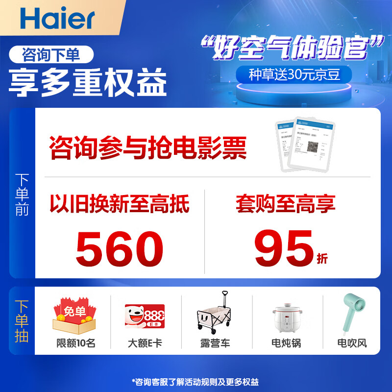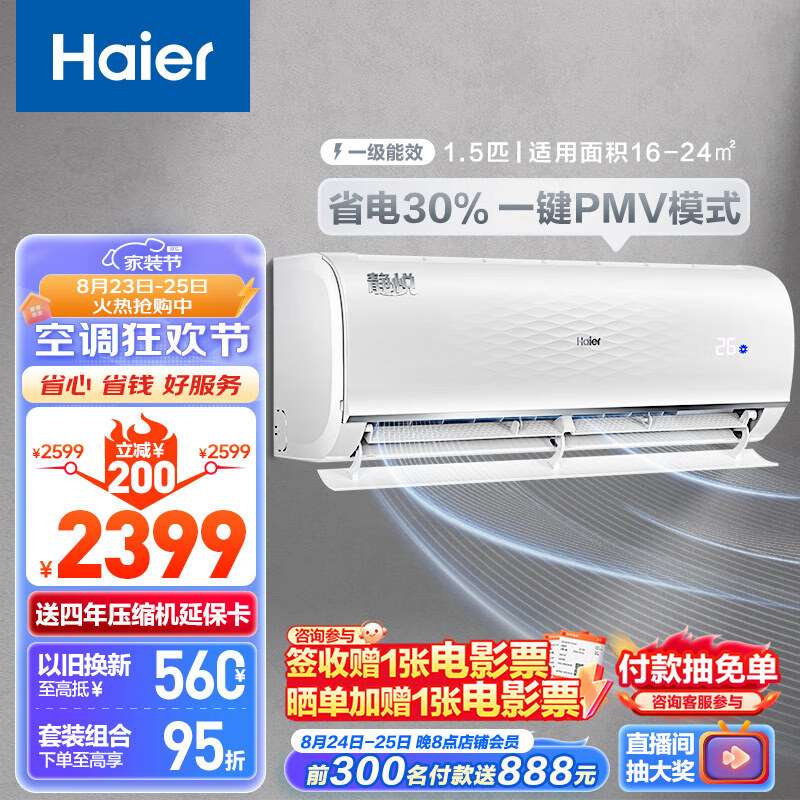 海尔 静悦1.5匹 新一级能效 变频 冷暖 卧室 壁挂式空调 挂机 节能省电 KFR-35GW/01KGC81U1以旧换新价格:2399.00元!